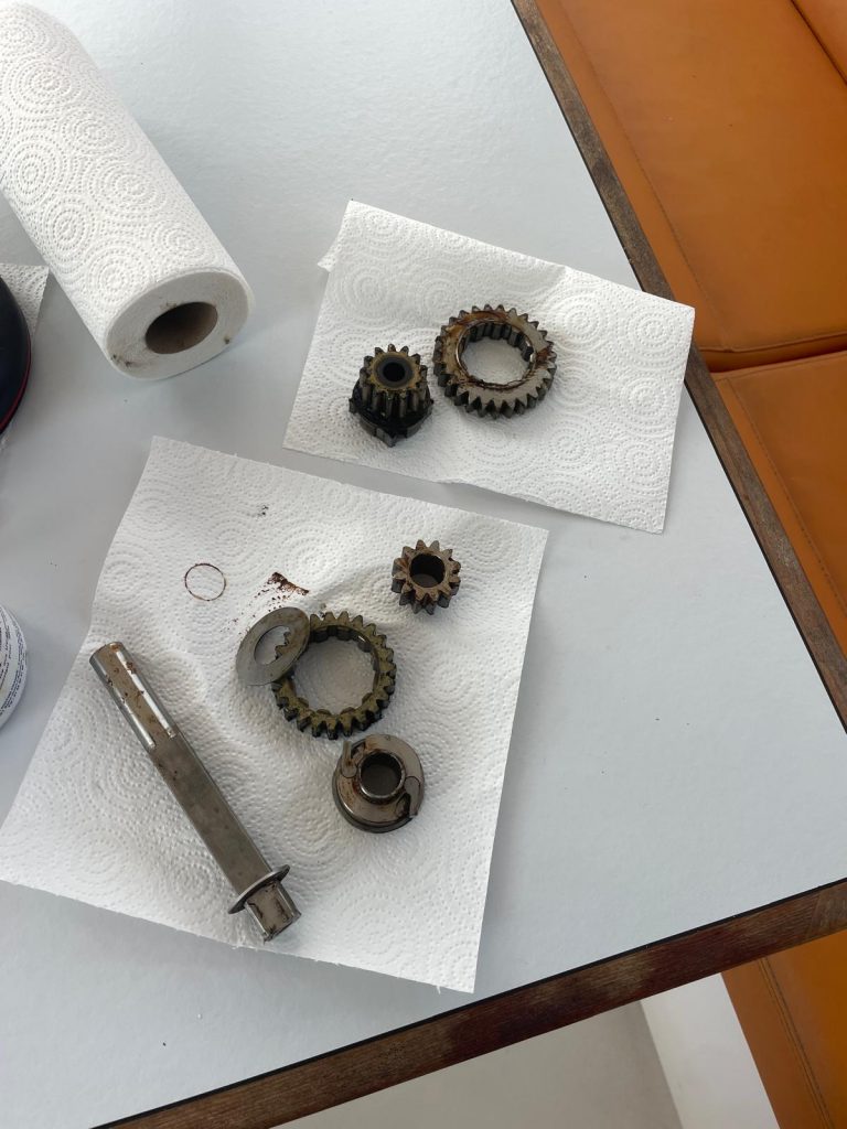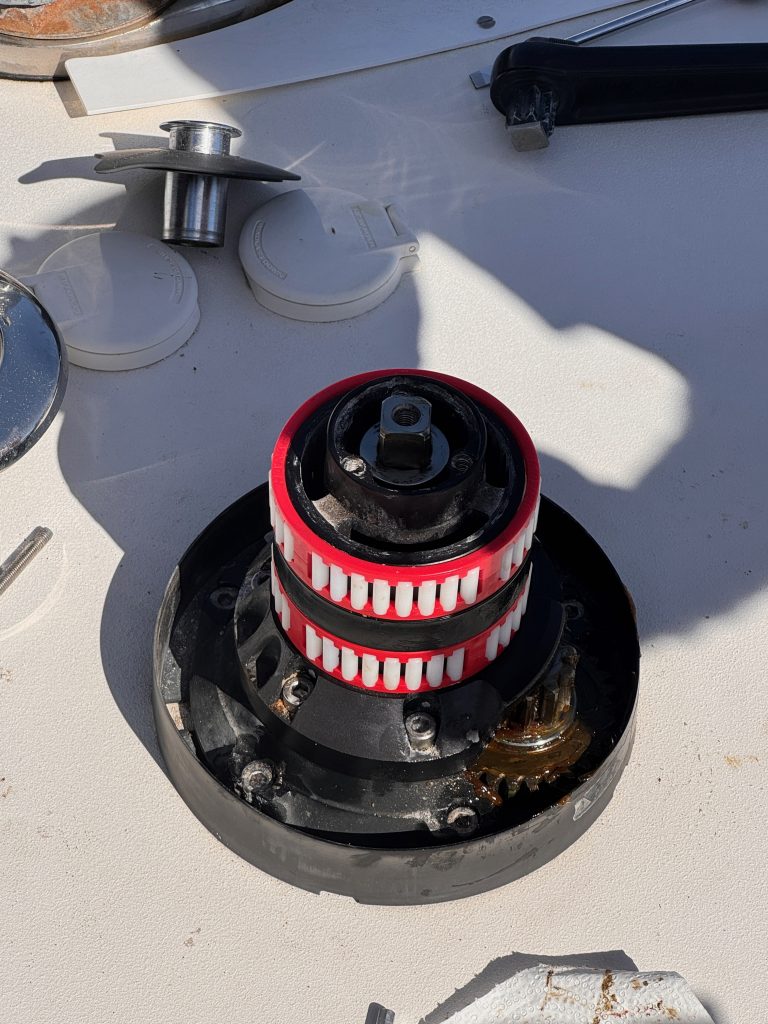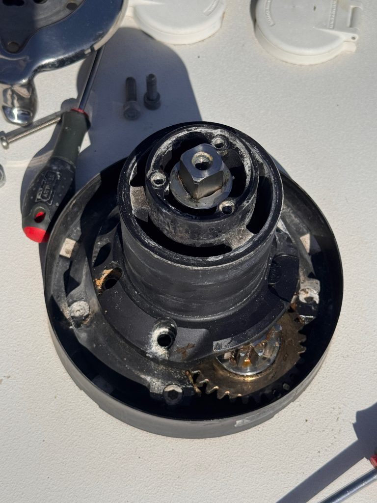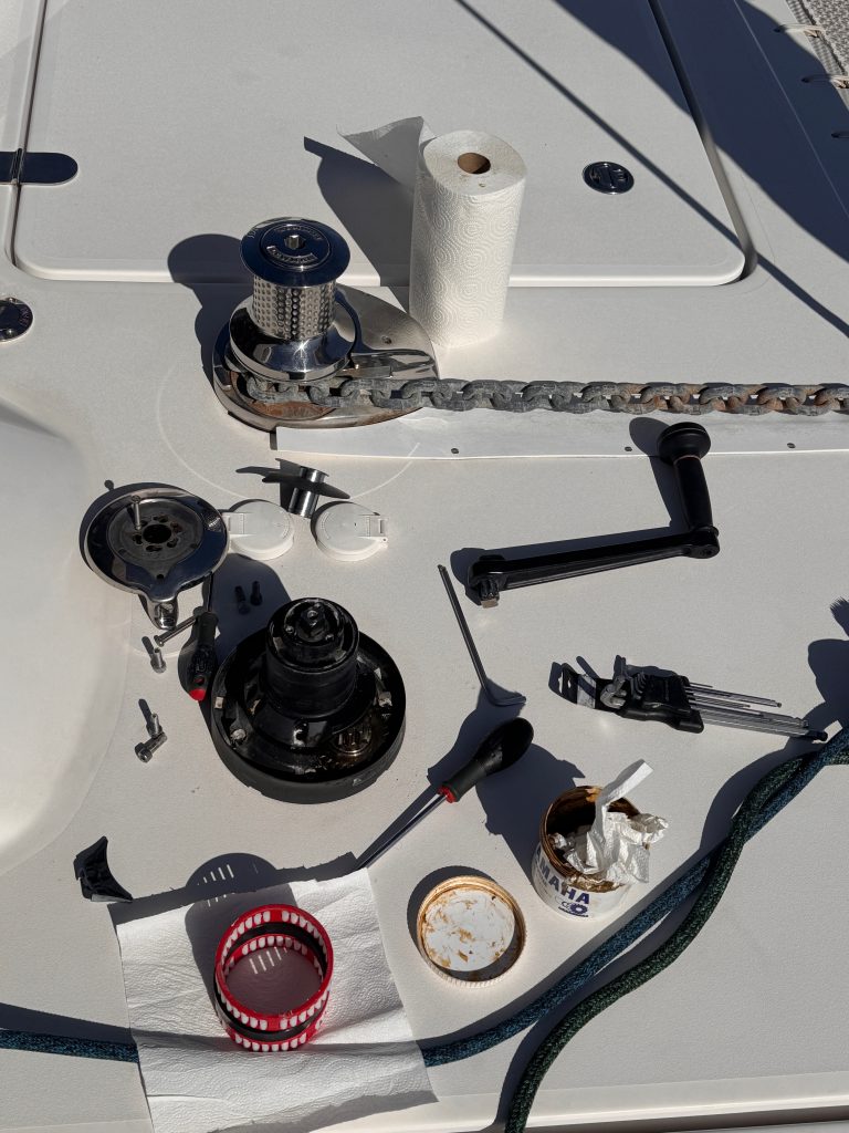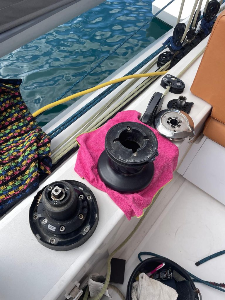 Zwei weitere Winschen sind noch komplett gereinigt, neu gefettet und die Sperrklinken mit einem Marineöl eingesprüht. Ein Job, für den man Zeit, Muse und Geduld haben muss. Und die Geduld … …