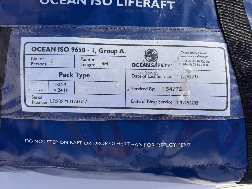 Unsere Rettungsinsel ist seit heute, frisch geserviced mit entsprechendem Zertifikat, wieder an Bord und in ihrem Staufach solide angeleint. Drei Jahre lang ist das Prüfzertifikat bei ISO Rettungsinseln gültig, ein weiterer Punkt auf der To-Do-Liste, der abgehakt werden kann.