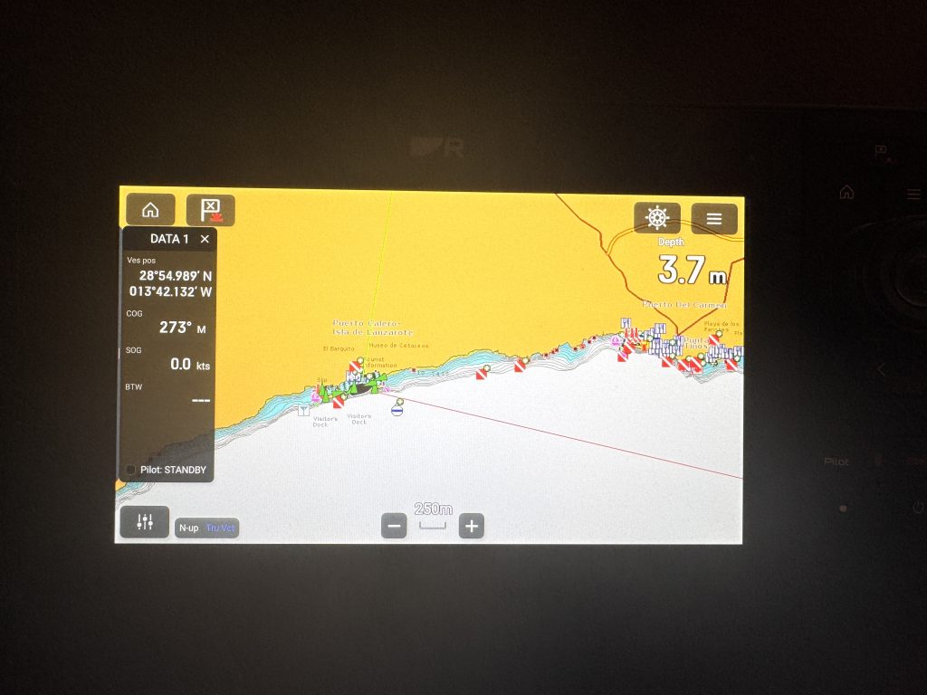 Was auch auffällt, ist die Brillanz und der Kontrast der Bildschirme. Selbst im hellsten Sonnenschein sind die dargestellte Seekarte und die Symbole tadellos sichtbar. Da wir seit vielen Jahren an die Handhabung der Raymarine Plotter gewöhnt sind, macht es natürlich viel Freude, die Geheimnisse der neuen Plotter durch Try and Error zu entlocken. Alternativ könnten wir natürlich auch 660 Seiten Bedienungsanleitung lesen, oder?