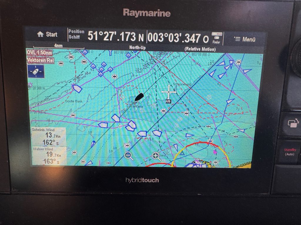So geht das den ganzen Tag, mal mehr, mal weniger Wind, mal Gennaker, mal Genua, mal Motor. An der Maasmündung und vor Vlissingen müssen wir höllisch aufpassen, es ist unglaublich viel Schiffsverkehr, große Frachter, Windmühlenplattform- und Bohrplattformversorger preschen mit über 20 Knoten heran und befinden sich auf Kollisionskurs zu unserer Hexe. Einer nach dem anderen.