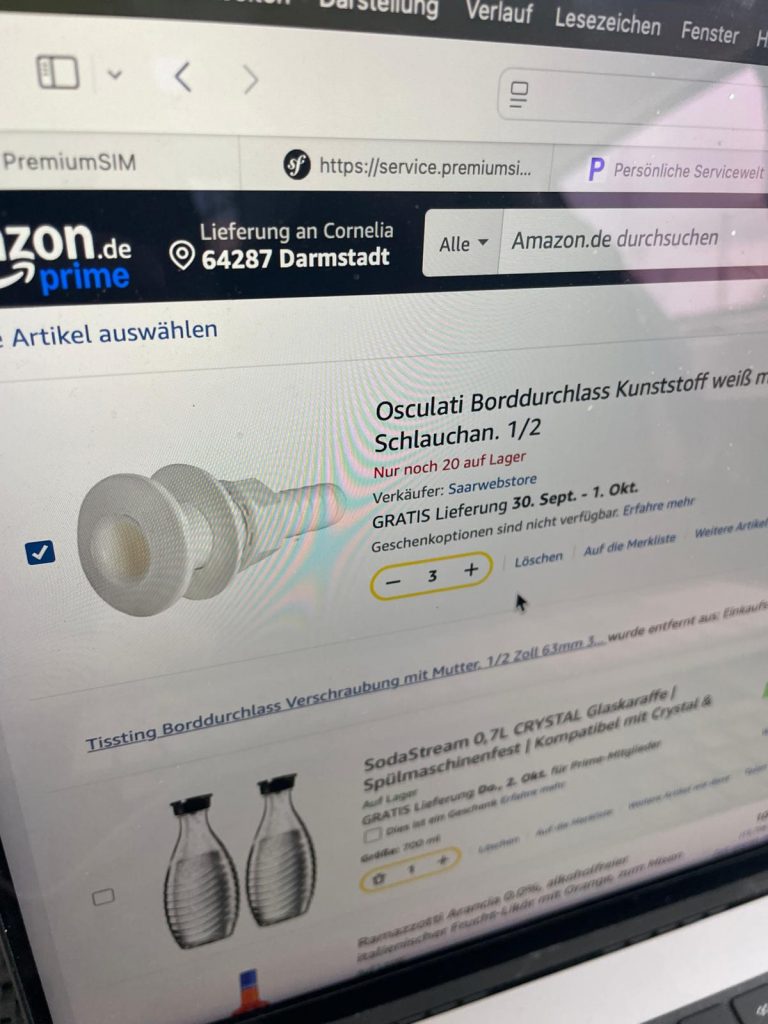 Bei strömendem Regen verlassen wir die hessischen Gefilde, und kurz nach 13 Uhr, ohne nennenswerte Stau auf der Route, steigen wir auf dem Parkplatz vom WSV aus. Wir räumen kurz ein, dann gehe ich mit Maureen bei Lidl einkaufen, einen ganzen Einkaufswagen voll. Der Inhalt wird verstaut, Matthijs ist auch schon da, um das neue Großfall einzuziehen.