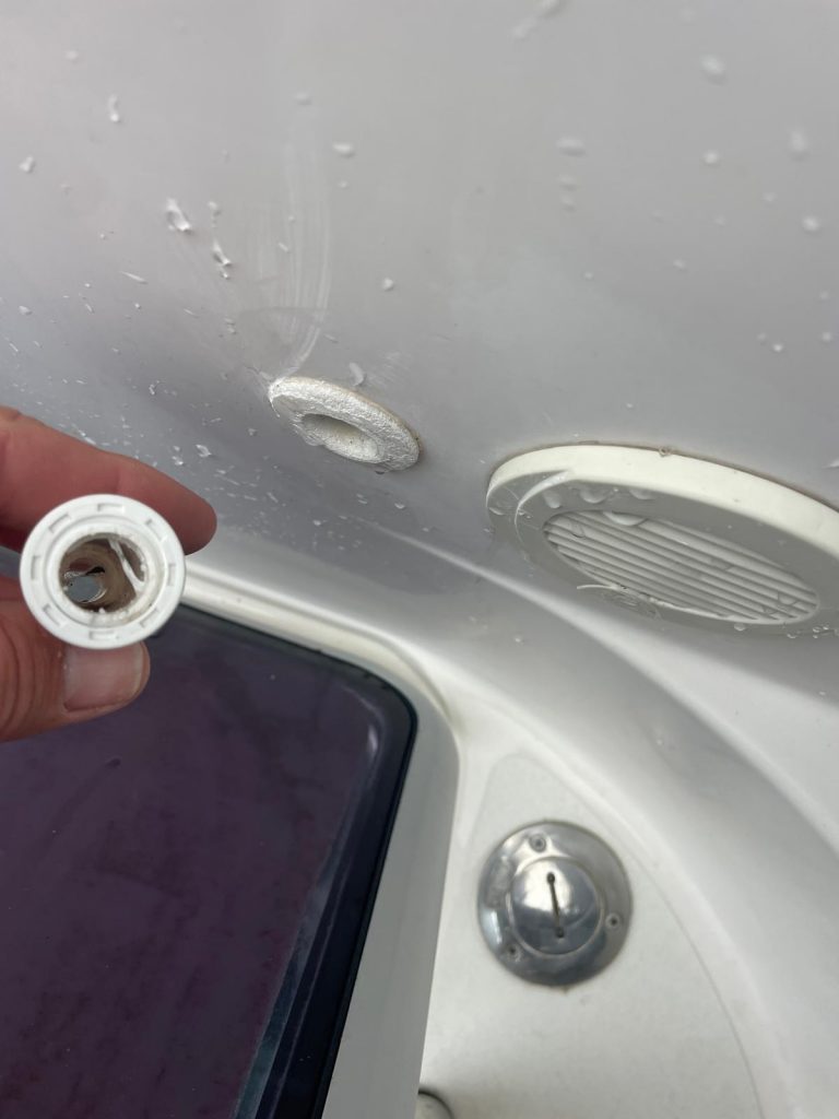 Am nächsten Morgen war ich dabei, Trinkwasser in den Tank einzufüllen, da piepste auf einmal der Bilgenalarm laut los, ich rannte schnell zum Einfüllstutzen und stellte das Wasser ab. Was war geschehen? Der Borddurchlass von der Tankentlüftung war wegen Alterung durch UV-Strahlung unbemerkt innen abgebrochen, und als der Wassertank voll war, ist das nachströmende Wasser, anstelle aus dem Überlauf abzulaufen, in den Motorraum geplätschert. Eben bis die Bilgenpumpe anlief, und mit ihr der Alarm losging. Nix Dramatisches, es wurde provisorisch mit einem Stückchen Tape abgedeckt. Cornelia hat schon einen neuen Borddurchlass bestellt, weil ausgerechnet die benötigte Größe sich nicht in unserem Ersatzteilsortiment befindet. Man kann ja nicht alles mit rum schleppen!
