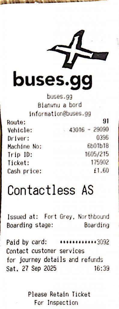 Danach habe ich noch eine offene Naht am Großsegel nachgenäht und schon war es Zeit, mit der Capitania im Schlepptau zur Bushaltestelle zu sprinten.  Da stand schon die Linie 91 parat, die uns einmal komplett, mit einem Zwischenstopp beim Wrackmuseum, um Guernsey herum kutschieren wird.