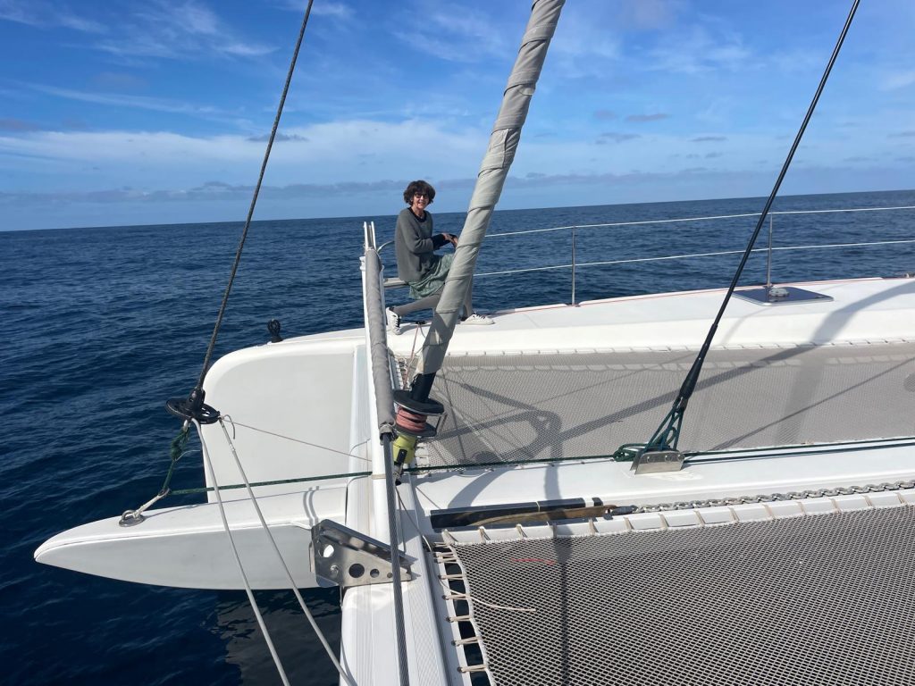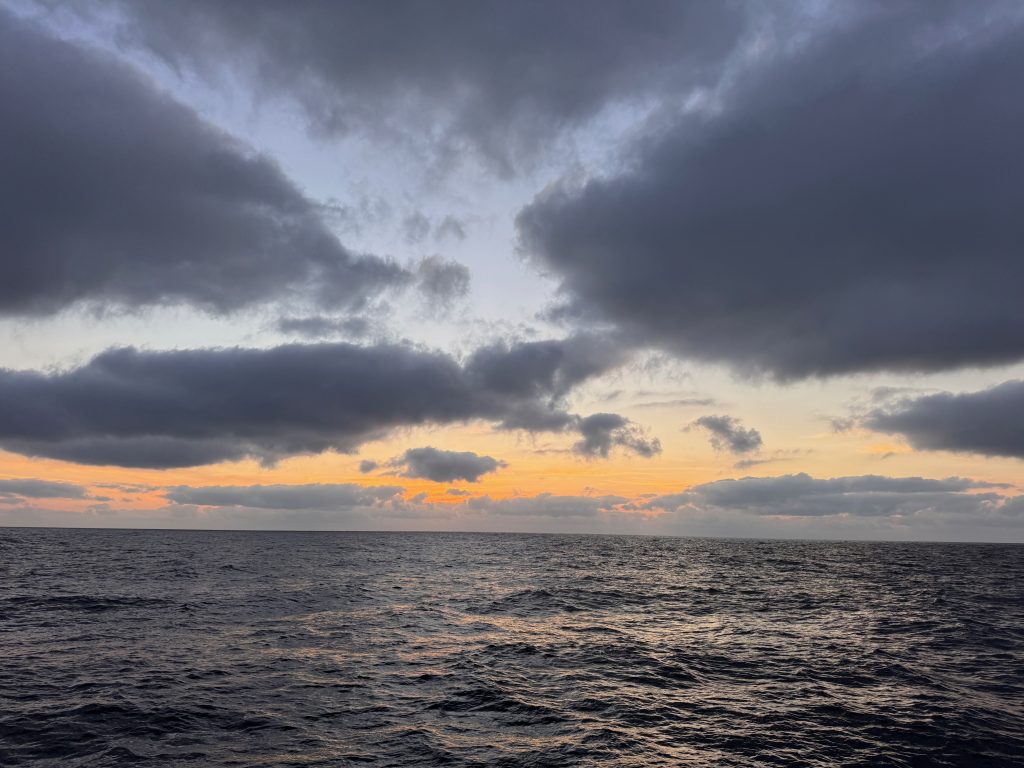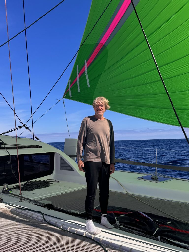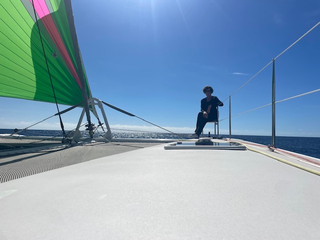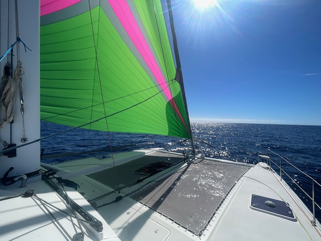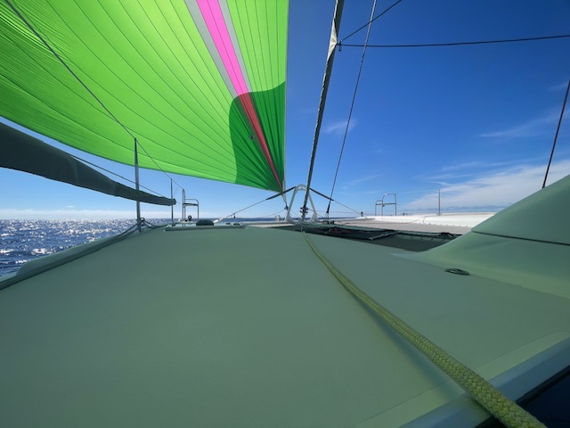 Seit Mitternacht zieht uns die Genua und das Großsegel übers Wasser, total ruhig, das ist sehr entspannt für Skipper und Navigatorin. Nach dem Frühstück wird wieder der Gennaker ausgerollt, bei einem Windwinkel von 135º zieht der am besten trotz eher leichten Windes zwischen sieben und zehn Knoten. Wir haben Glück, tatsächlich gibt es  mehr Wind, zumindest da, wo wir gerade sind, als in allen Voraussagen, PredictWind, ECMWF, GFS, Spire und UKMO angekündigt war. Wir wollen mal nicht meckern und freuen uns über einen Tag mit Gennaker.