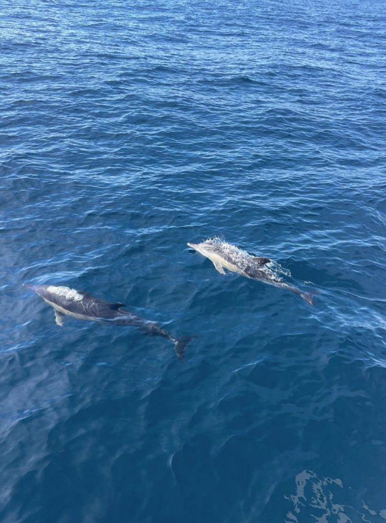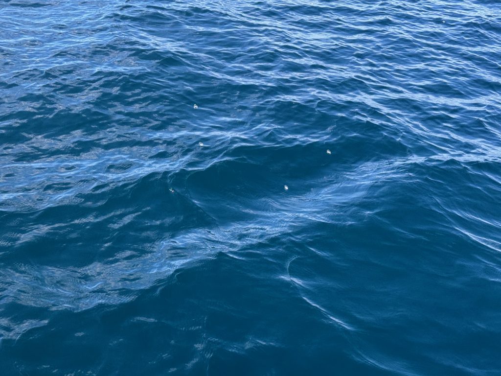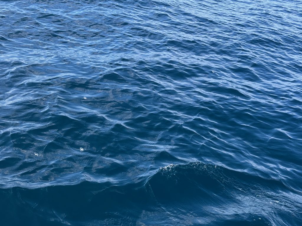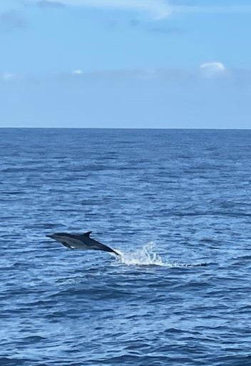 Jetzt sind wir wieder allein auf dem großen weiten Meer, das wegen der herrschenden Flaute auch total ruhig ist. Mittags und am Nachmittag kommen kleine Delphine, sie sind zunächst auf der Jagd, und später kommen sie zum Spielen am Boot vorbei, das macht immer noch Spaß, die hüpfenden und tauchenden Tiere zu beobachten.