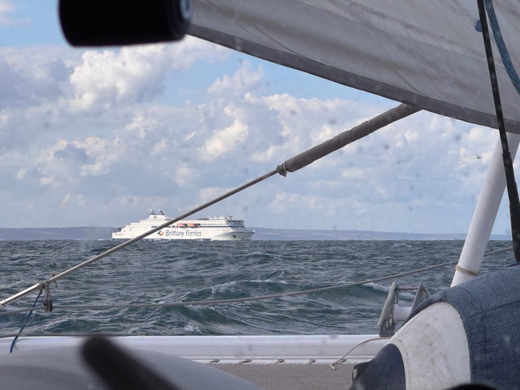 Der Wind bleibt wieder beständig zwischen 20 und 24 Knoten, allerdings ist nun der Windwinkel besser, ungefähr 130 Grad, wir kommen gut voran, nur die Wellen bleiben kabbelig. Aber als wir an Cherbourg vorbei sind und in die Landabdeckung kommen, wird die See plötzlich ganz ruhig. Auch der Wind hat nachgelassen, aber hier ist so viel Strom, der momentan glücklicherweise mit uns geht, dass wir trotzdem noch gut voran kommen.