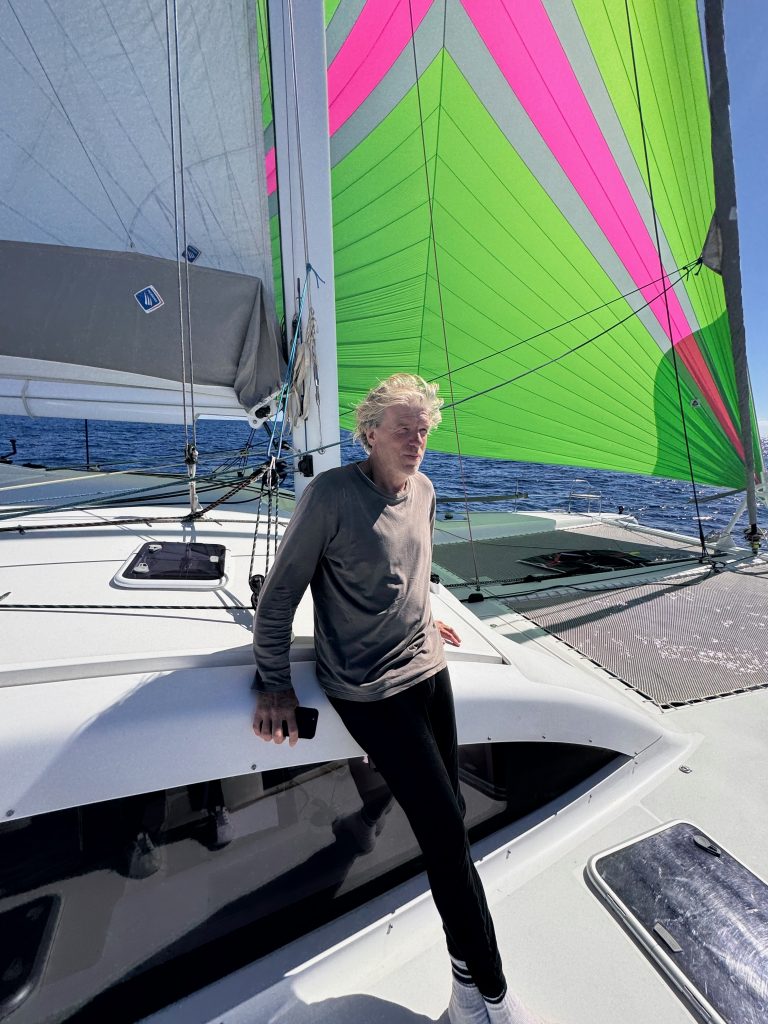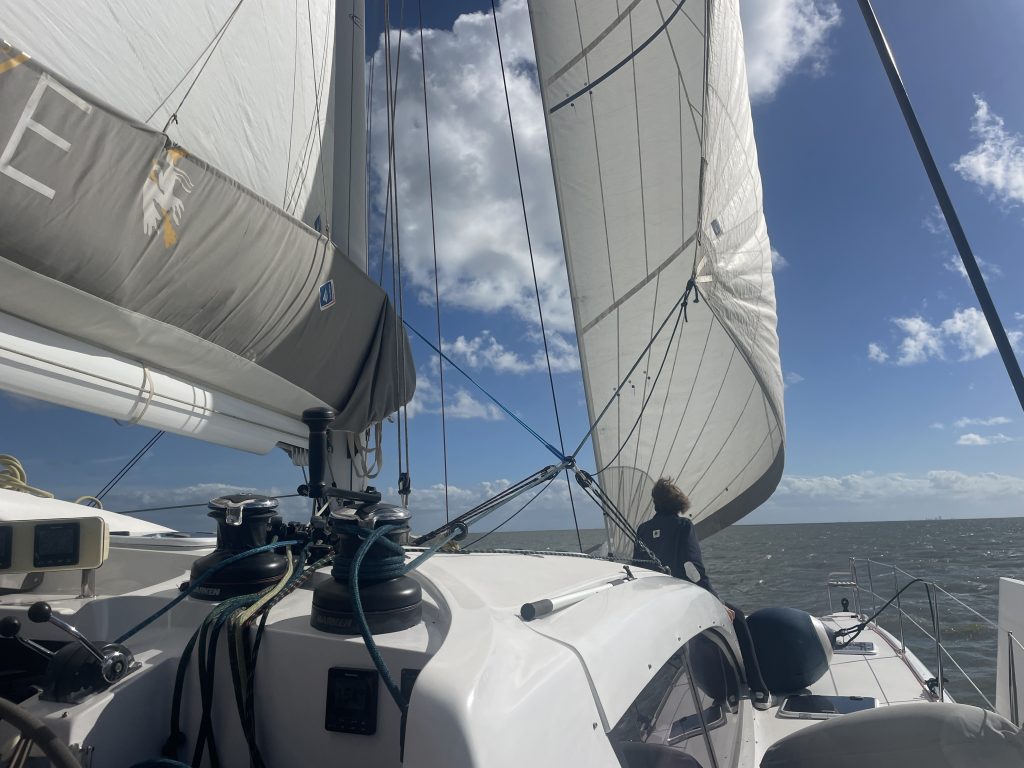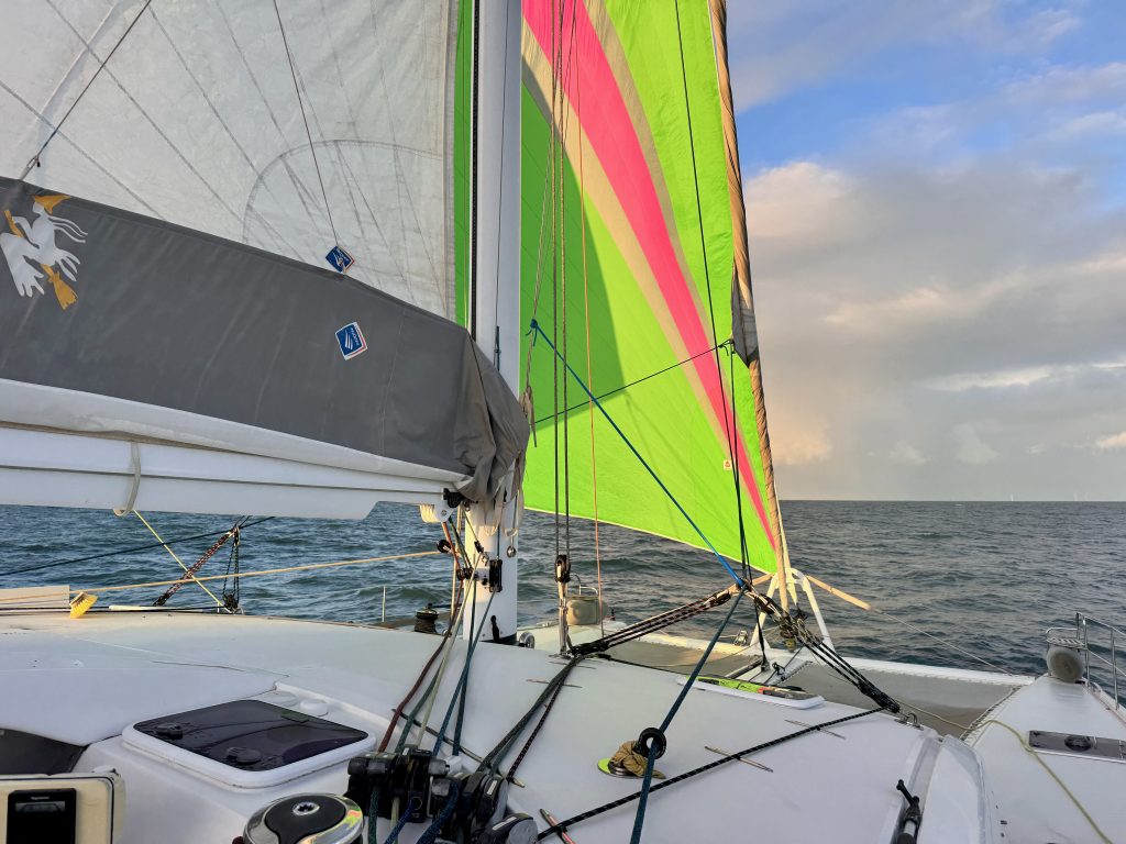 Es ist wenig Wind, 10-14 Knoten, aber genau von hinten, und es steht noch eine unangenehme Welle von dem Nordwind der letzten Wochen. Nach einer Weile motoren jedoch setzen Volker und Matthijs den Gennaker, und wir kreuzen vor dem Wind mit sieben bis acht Knoten Geschwindigkeit.