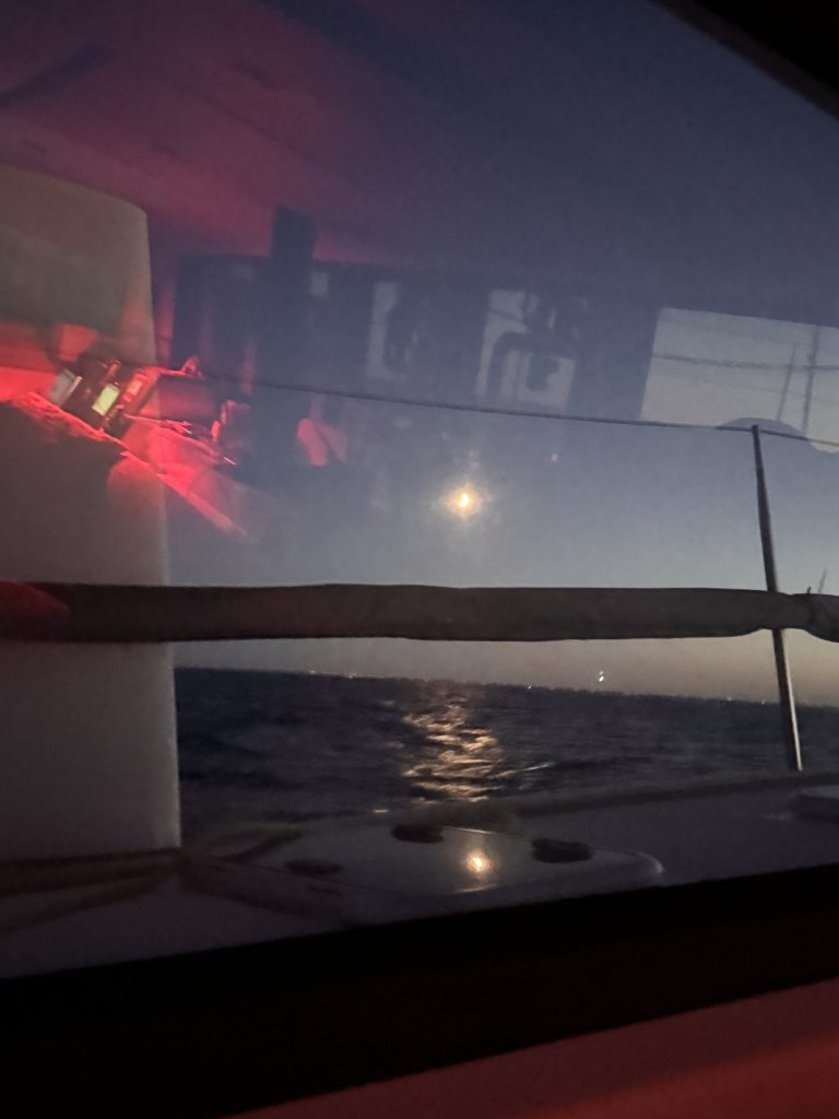 Ein schicker schneller Trimeran, “Viabilis”, ein Solo-Segler, kommt – ohne Vorfahrt zu haben – auf uns zu, die ganze Zeit auf Kollisionskurs, ich rufe ihn über Funk, erhalte zwar keine Antwort, aber er ändert seinen Kurs. Um 23:30 segeln wir ganz nah an der Segelyacht Giulia vorbei, sie fährt nur mit Vorsegel und ist daher deutlich langsamer als wir. Es kommt noch ein Boot auf uns zu, dass kein AIS hat, aber Volker hat es gesehen, und die letzte Kardinalboje ist auch vorbei, jetzt muss ich ins Bett. Volker hat am Tag zwei Stündchen geschlafen, er übernimmt jetzt die Wache.