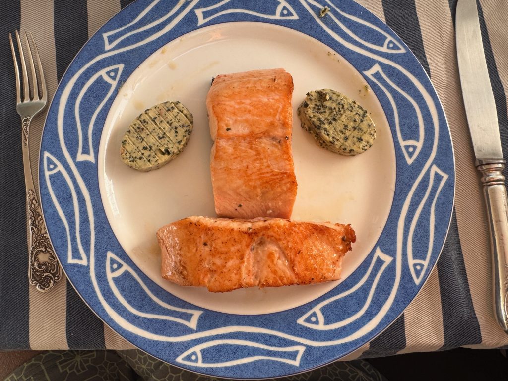 Um 18:00 Uhr ist das Barometer um zwei Strich gefallen auf 1023, und zum Sonnenuntergang ziehen  ein paar kleine Wölkchen auf. Bei uns gibt es ein Ribeye für Volker und für mich Lachsfilets mit Kräuterbutter, dazu Salat und Knoblauchbaguette, himmlisch!
