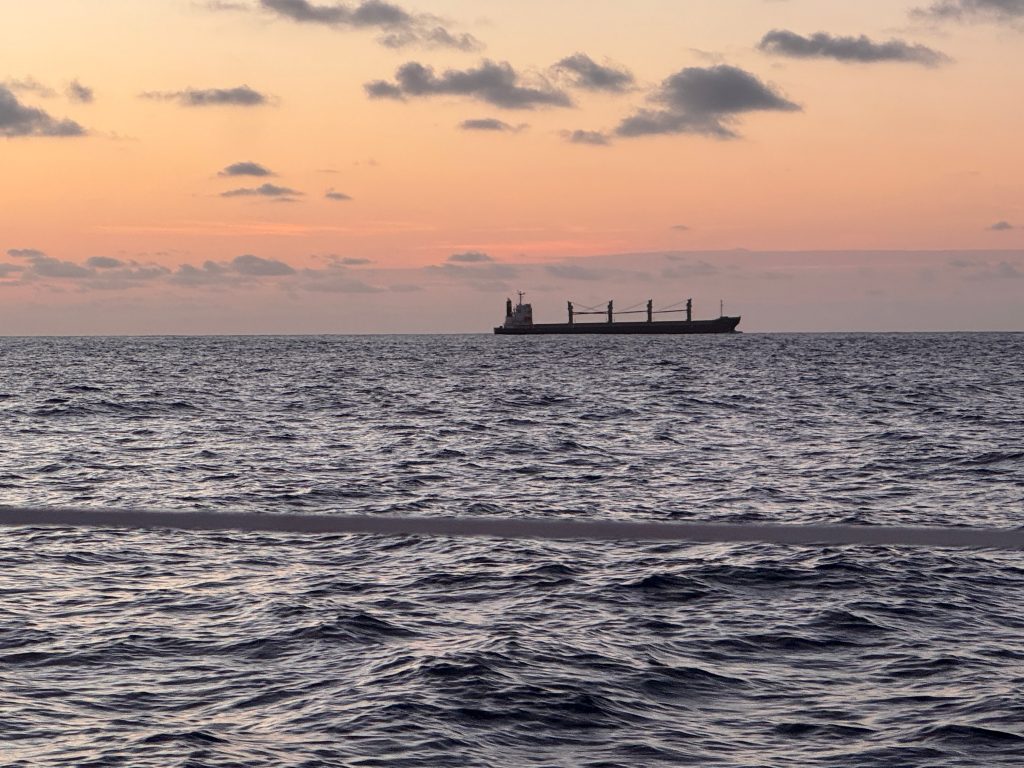 Dank der vielen Motorstunden konnte ich auch eine Maschine Wäsche waschen, und dank der warmen Sonnenstrahlen ist sie auch schnell getrocknet. Und das Wasser war warm zum Duschen! Das Meer ist flach, man spürt nur die atlantische Dünung, die das Boot leicht anhebt und senkt. Und viel Verkehr ist hier auch nicht. Ein paar Frachter sind so weit entfernt, dass man sie trotz guter Sicht nur auf dem AIS sehen kann, am Horizont habe ich sie jedenfalls nur den einen oder anderen gefunden.
