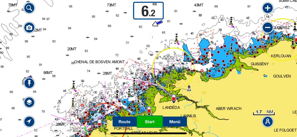 22:30 Uhr: Es ist schon gigantisch, wir segeln entlang der bretonischen Küste mit ihren zahlreichen steinigen Untiefen, und halten uns schon weit draußen. Trotzdem ist es mega spannend, links, in 210º, blinkt der Leuchtturm der Ile vierge, Jungfraueninsel (?), weiß alle fünf Sekunden, in 230º blitzt das Westkardinalzeichen „Lizen Ven“, das auf die Untiefe daneben aufmerksam machen soll, und dann kommt von links auch noch ein Fischer angepest, die „Etoile d’Arvor“, der es sehr eilig hat, und offensichtlich noch nicht oder nicht mehr beim Fischen ist. Vor einer halben Stunde lag ein Nordkardinalzeichen auf unserer Route, sie alle haben bretonische Namen, dieses hier z.B. „Aman ar Ross“, was immer das bedeuten soll. Eines liegt noch vor uns, diesmal kein typisch bretonischer Name, „Grande Basse de Portsall“, ist wieder ein Westzeichen,  also neun weiße Blitze alle 15 Sekunden. Danach entfernen wir uns weiter vom Land und seinen steinigen Ausläufern, die Navigatorin kann entspannen, bis sie abgelöst wird.