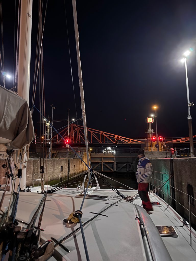 Während der ca. 15 Meilen langen Fahrt durch den Nordseekanal wird es langsam Abend, und als wir in die Zeesluis vor Ijmuiden fahren, ist es eine stockdunkle Nacht, wir sind nur einenTag nach Neumond. Das war spannend, denn obwohl die Schleuse 11 m breit ist, blieb an jeder Seite neben den Fendern nur wenig Platz.