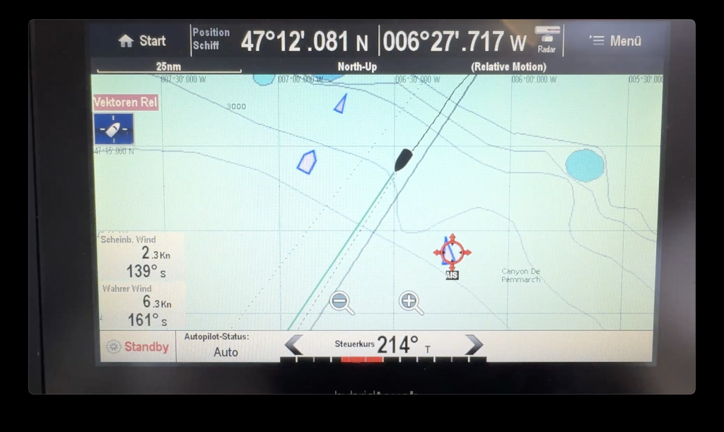 Um 22:15 schlafen meine beiden Herren, der eine hat sich ins Bett verabschiedet, der andere ist auf dem Sofa eingeschlafen, ich versuche, den Überblick zu behalten. Ich sehe ganz viele Fischer auf dem Radar, aber vorhin ist einer an uns vorbei gefahren, der hatte offensichtlich kein AIS an, den hatte ich daher nicht auf dem Schirm, nur plötzlich fuhr ein hell erleuchtetes Boot an uns vorbei.