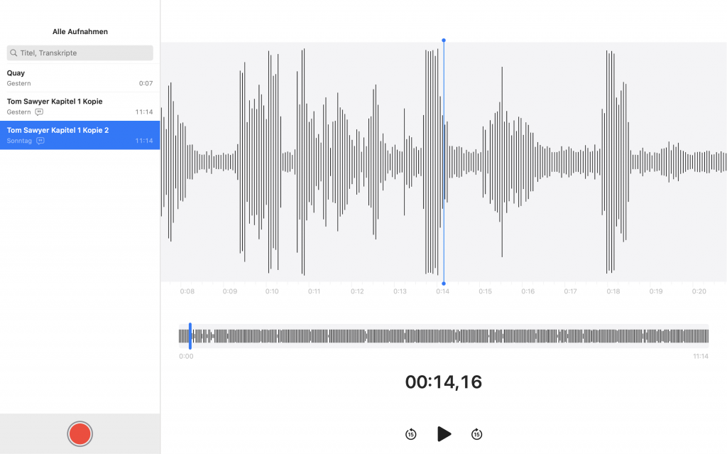 Während Volker noch einmal schlafen kann, bevor ich zu Bett gehe, lerne ich alles über Sprachmemos, wie man sie in dem Programm verarbeitet, bearbeitet, Teile raus schneidet oder einfügt, und wie man mehrere Aufnahmen, dann allerdings in einem anderen Programm, IMovie, zusammen schneiden kann.