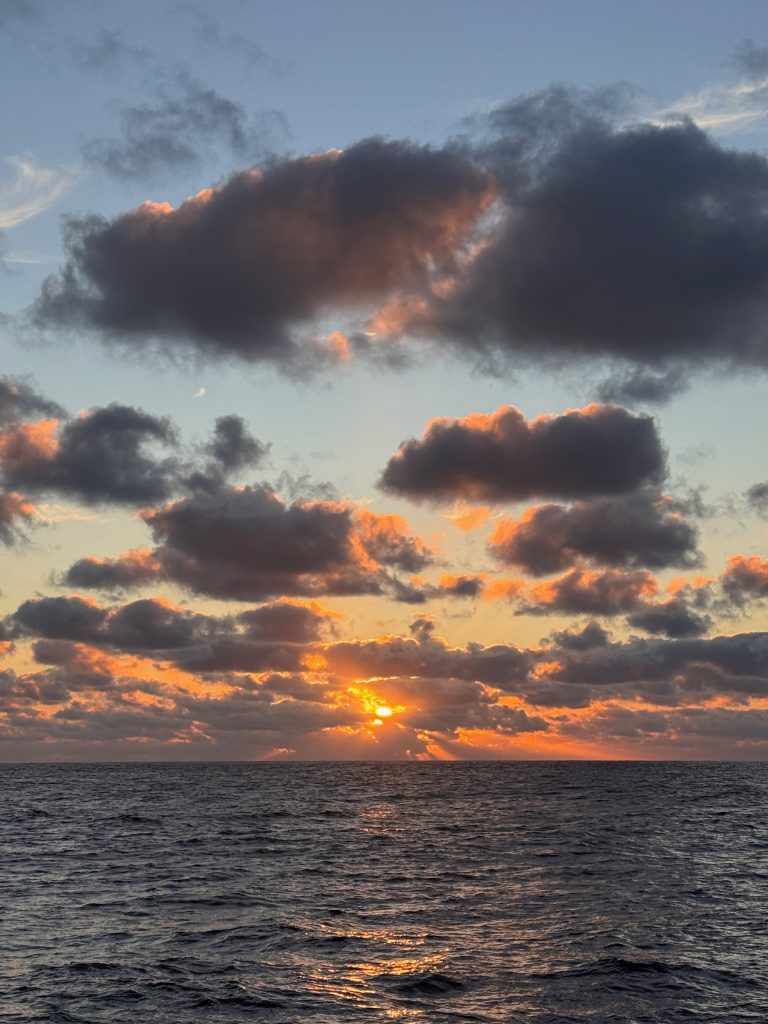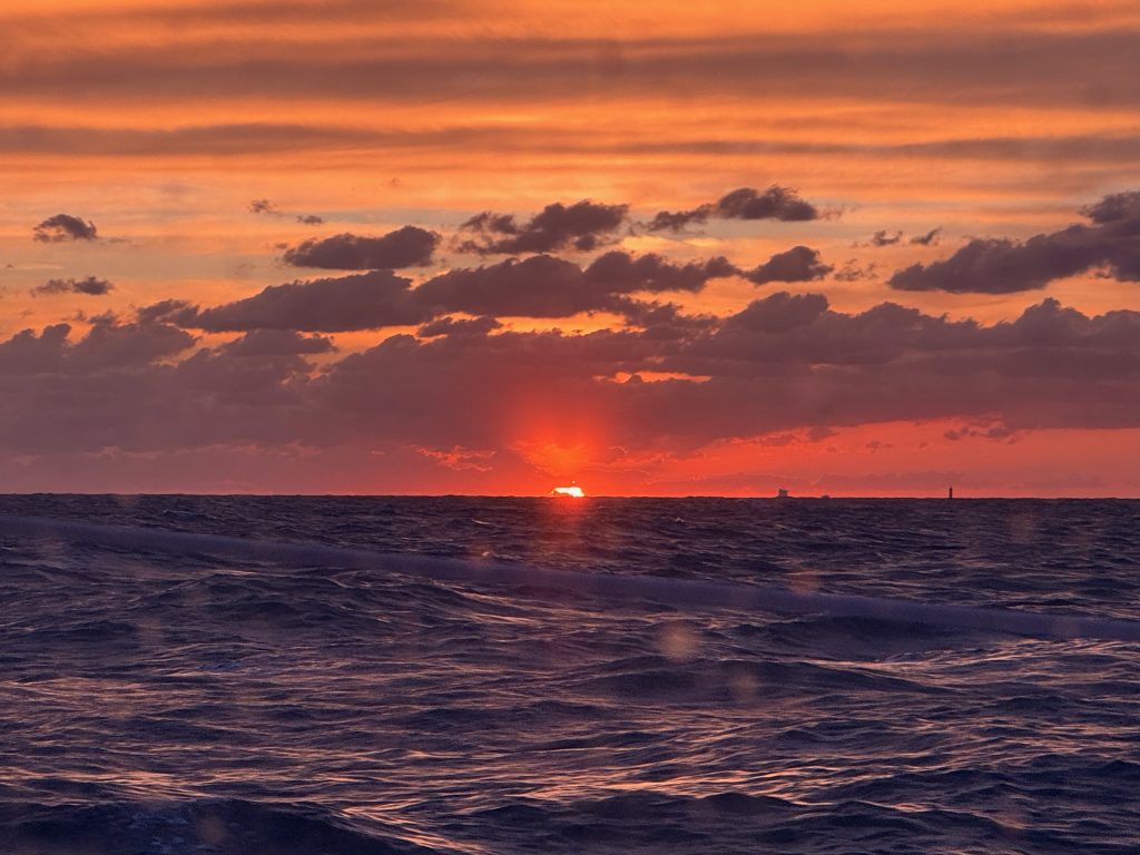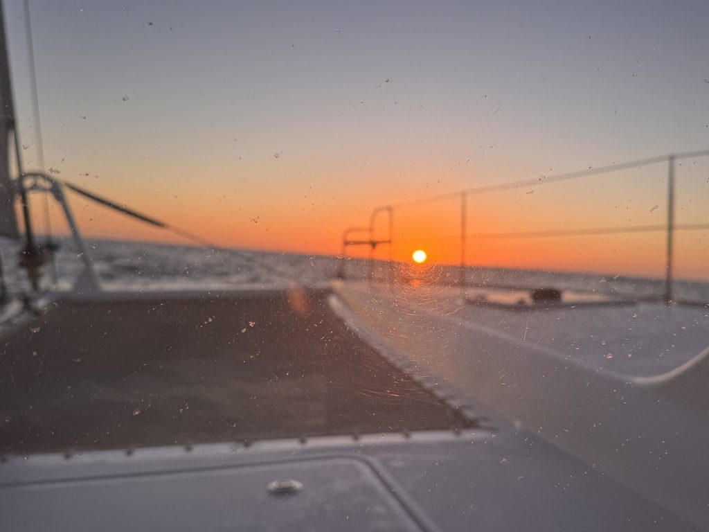 Der Gennaker bleibt stehen bis nach dem Abendessen, zunächst war es sehr wenig Wind, ständig wechselnd wischen sieben und zehn Knoten, wir mussten dauernd den sehr schwankenden Kurs anpassen. Ab vierzehn Uhr stabilisiert sich der Wind bei 14 Knoten,  es geht mit sieben bis acht Knoten schnell voran. Zum Sonnenuntergang sind es öfter über 15 Knoten Wind, wir rollen das bunte Segel ein, so ist die Nacht ein bisschen entspannter. Mit der Genua muss man nicht dauernd auf jede kleinste Winddrehung reagieren, die steht ruhiger.