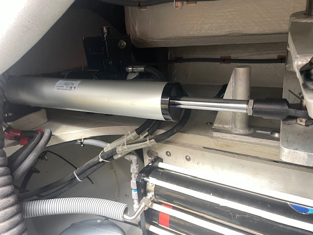 Der Hydraulikzylinder des Autopiloten im Vordergrund, mit seiner Schubstange und im linken hinteren Bildrand dem dazugehörigen Ausgleichsbehälter mit dem Hydrauliköl.