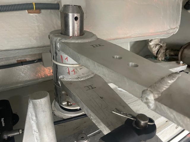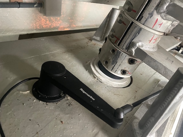 Der aufgeschraubte Ruderquadrant mit seinen beiden Armen, das deutlich hellere runde obere Stahlgebilde ist die Achse vom Ruder selbst. Sie muss kraftschlüssig mit dem Ruderquadrant verbunden sein.