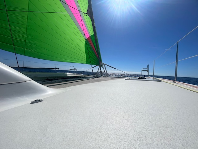 Das Schöne ist, es wird täglich wärmer und für das Leben im Warmen ist der Katamaran wie geschaffen. Mit seinem großen Cockpit und dem enormen Platz auf den Trampolinen und den Außenflächen lädt das Boot geradezu zum Sonnenbaden und Relaxen ein.