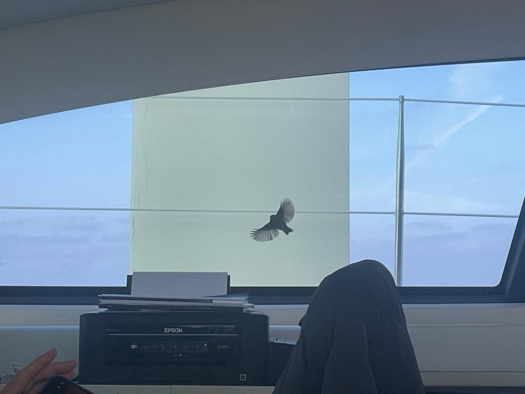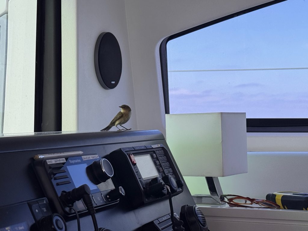 Tatsächlich kommt der Wind um 13:30 statt von Backbord von Steuerbord, wir setzen wieder den Gennaker. Bei zwölf Knoten Wind aus 150º fährt die Hexe ruhig ihren Kurs. Um 14:15 Uhr kommt plötzlich ein kleiner Vogel in den Salon geflogen und Volker packt ihn ganz zart und trägt ihn raus, hoffentlich findet er seinen Weg zurück. Er begleitet uns tatsächlich bis zum frühen Abend, gerade habe ich ihm ein Schälchen mit Wasser hingestellt, da war er fortgeflogen. Hoffentlich schafft er es bis zum Land.