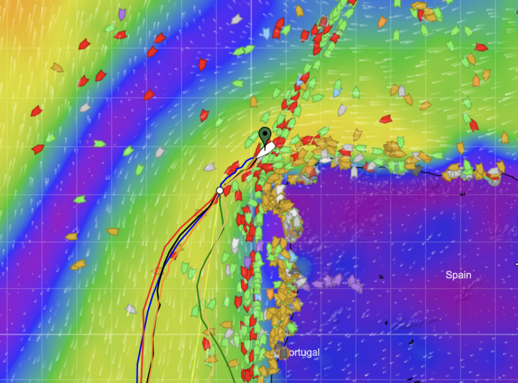 Die berüchtigte Biskaya liegt nun hinter uns, und sie war uns mehr als gnädig. Es war unsere 3. Biskayaüberquerung, mit Abstand aber auch die langsamste. Kleine Etmale, wenig Wind aus unterschiedlichen Richtungen, viele Seemeilen mit dem bunten Gennaker. Alles besser als ein Sturm in diesem zu Recht gefürchteten Seegebiet. Wir  beklagen uns nicht über das langsamere Vorankommen und sind froh, dieses Wetterfenster genutzt zu haben. Noch 900 Seemeilen bis Lanzarote liegen vor uns.