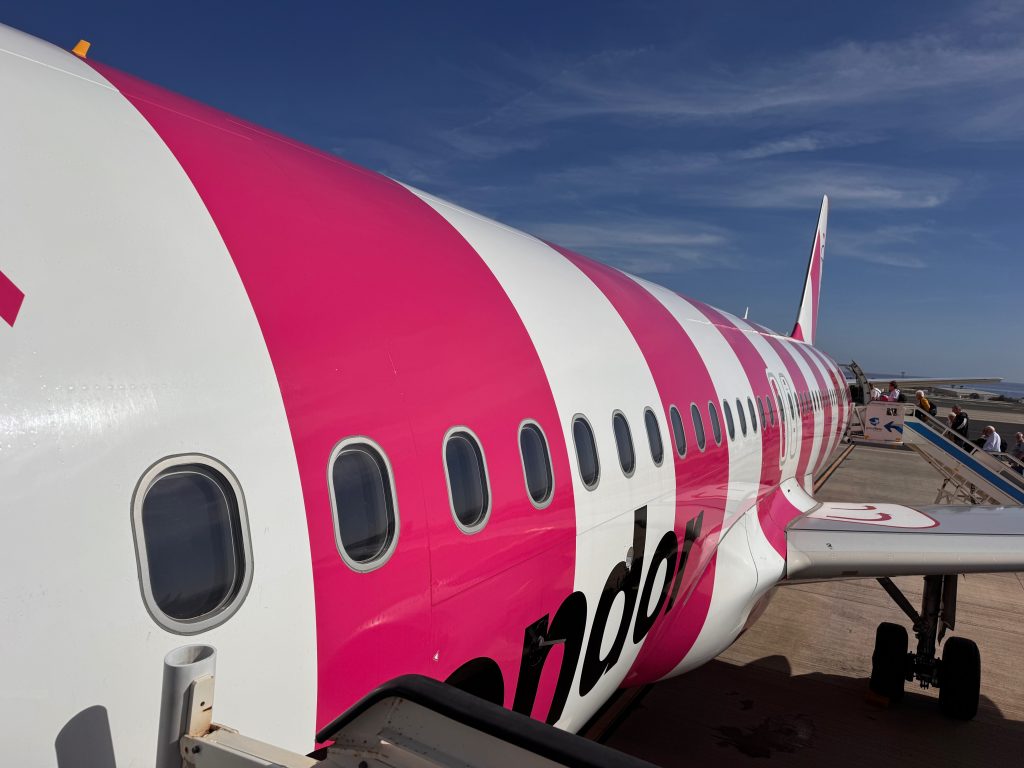 Der pinke Flieger bringt uns nach DeutschlandGanz oben ist unser Mast im Hafen von Puerto Calero