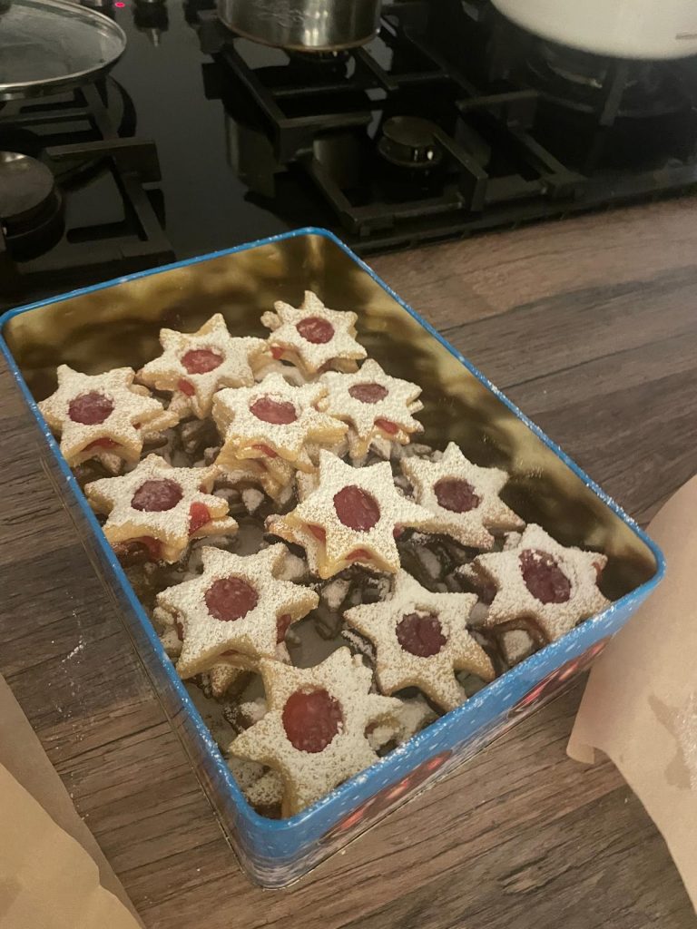 Es fühlt sich seltsam an, im T-Shirt Plätzchen zu backen, und man muss beim Ausstechen des Teigs höllisch aufpassen, dass man nicht zu lange damit rummacht, denn wenn der Teig zu warm wird, bekommt man die Teilchen kaum noch heil aufs Backblech.