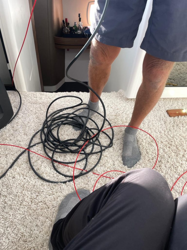 Jedenfalls, einen Tag vor der Abfahrt ist klar, dass ich noch die Kabel verlegen muss. Last Minute eben. Und damit es dann echt spannend wird mit dem pünktlichen Erreichen des Flugzeugs, standen Material und Helfer am Tag des Abflugs auf der Matte. Und da muss man sagen, dass das nachträgliche Kabellegen in der Hexe wirklich spitzenmäßig von Outremer geplant und damit relativ simpel ist. Man muss nur nur die Wege kennen und das ist nach all den Jahren glücklicherweise der Fall. Und trotzdem steckt manchmal der Teufel im Detail.