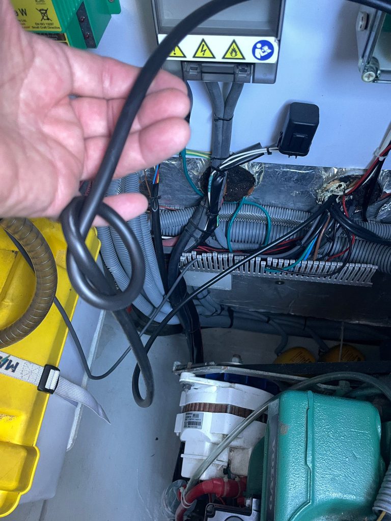Bisher ist das so, dass bei den AGM-Batterien, nur bei einer höheren Motordrehzahl, viele Ampere in die Batterien geflossen sind. Man muss wissen, dass bei höherer Drehzahl, durch die kleinen Schaufelrädchen an der Lichtmaschine, die Lichtmaschine dann auch ausreichend gekühlt wird. Die zukünftigen Lithiumphosphatbatterien sind dagegen so energiehungrig, dass sie schon im Standgas maximal viel Ampere aus der Lichtmaschine saugen. Häufig führt das zum frühen Tod der Lichtmaschinen wegen Überhitzung. Damit das nicht geschieht, muss jeweils ein neues Kabel von der Lichtmaschine zum neuen Batteriemanagementsystem, das nennt sich „Cerbo“ bei der Firma Victron, verlegt werden. Das besagte Kabel hätte man, bzw. ich schon lange verlegen können, da war die Planung aber wohl nicht so top.