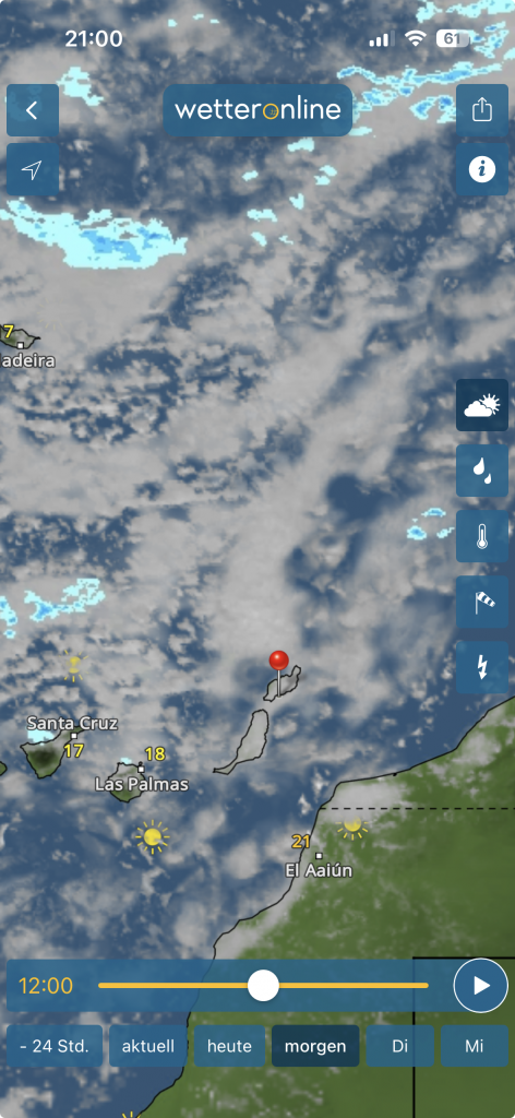 Nach dem Wochenende soll endlich wieder das lanzaroteñische Winterklima zurück kommen, 20 bis 25 Grad am Tag und nicht kälter als 18 Grad in der Nacht. Na, dann hoffen wir mal, dass die Vorhersagen der Wetterberichte stimmen. Aber, trotz allem Gejammere ist es hier ja doch deutlich wärmer als im kalten Deutschland oder im noch kälteren Kanada!