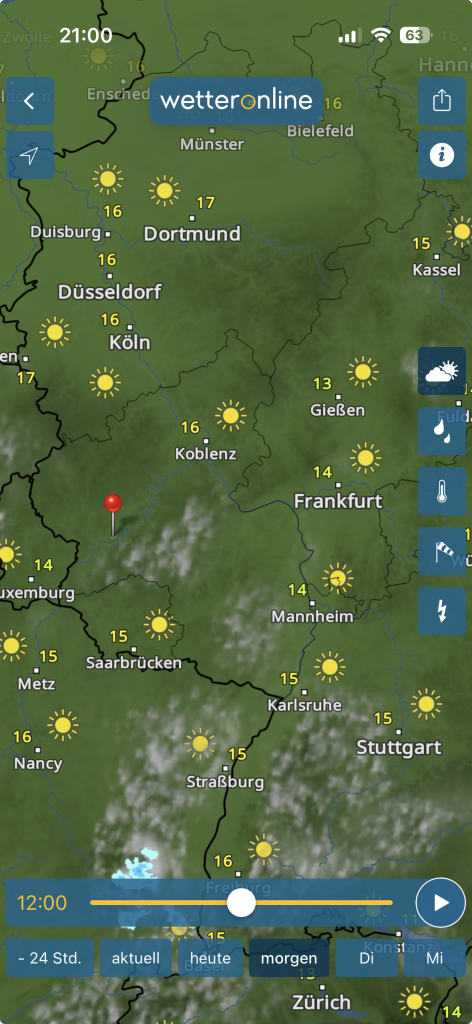 Ab 20 Uhr soll es regnen und feucht soll es in den nächsten Tagen weiter gehen, bei Temperaturen zwischen 13-17 Grad. Nicht schön!