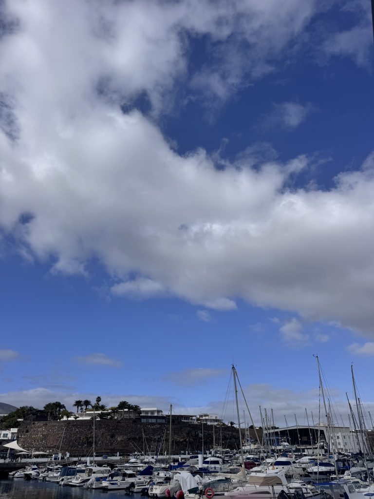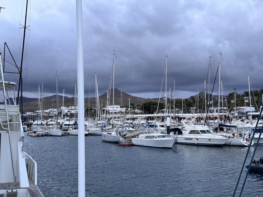 Nach einem angenehmen Flug sind wir jetzt wieder an Bord, und das Wetter auf unsererLieblingsinsel ist deutlich schlechter als deutsche Frühling. Die Temperaturen sind wohl dieselben, aber dunkle Regenwolken ziehen aus Nordwesten heran, ein Sturmtief ist im Anmarsch. Der letzte kanarische Sturm ist gerade mal drei Tage her, bei bis zu 50 Knoten Wind  hat es ein paar unserer Zeltgummis zerrissen, die ich gestern gleich durch neue ersetzt habe.