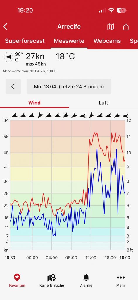 Zum Schluss noch: Gestern Abend ging es dann richtig rund im Hafen. Böen mit 38 Knoten pfiffen kreischend durch den Mastenwald, was für eine Geräuschkulisse. Bei einer Messstation in Arrecife wurden für über zwei Stunden Windböen von 56 Knoten gemessen, das sind 11 Beaufort, ein Orkan.